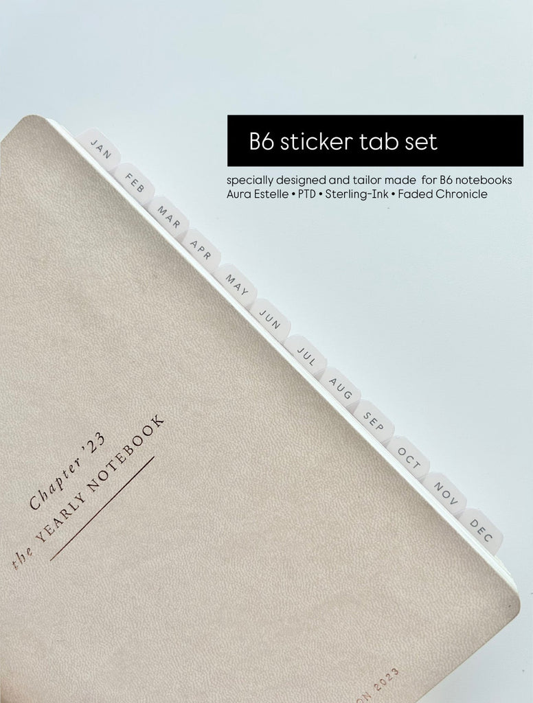 width of 12 month tabs tailored to extend the length of a B6 but are ideal for any book bound planner. for remaining 6 tabs it would be best to start a new row of tabs or use as top tabs