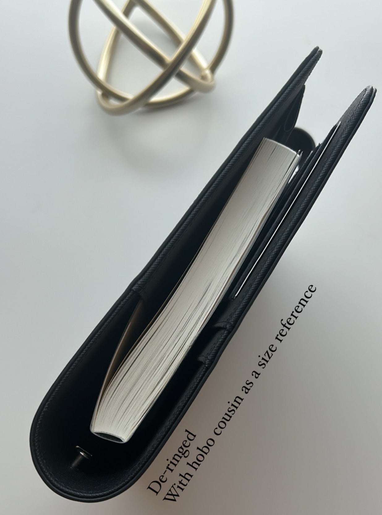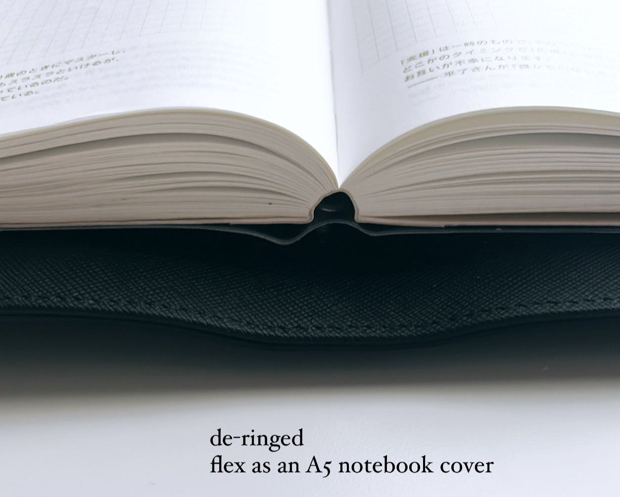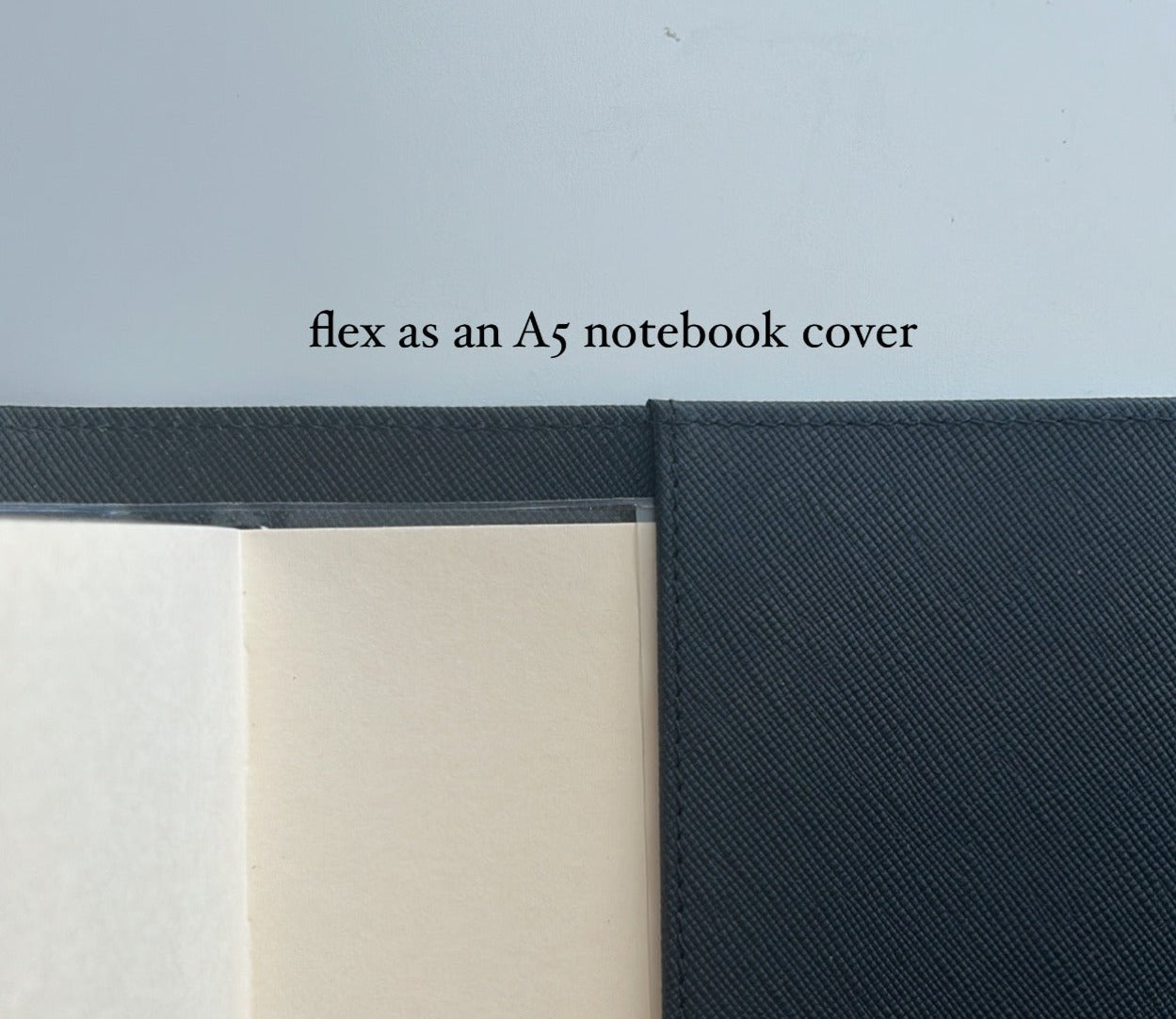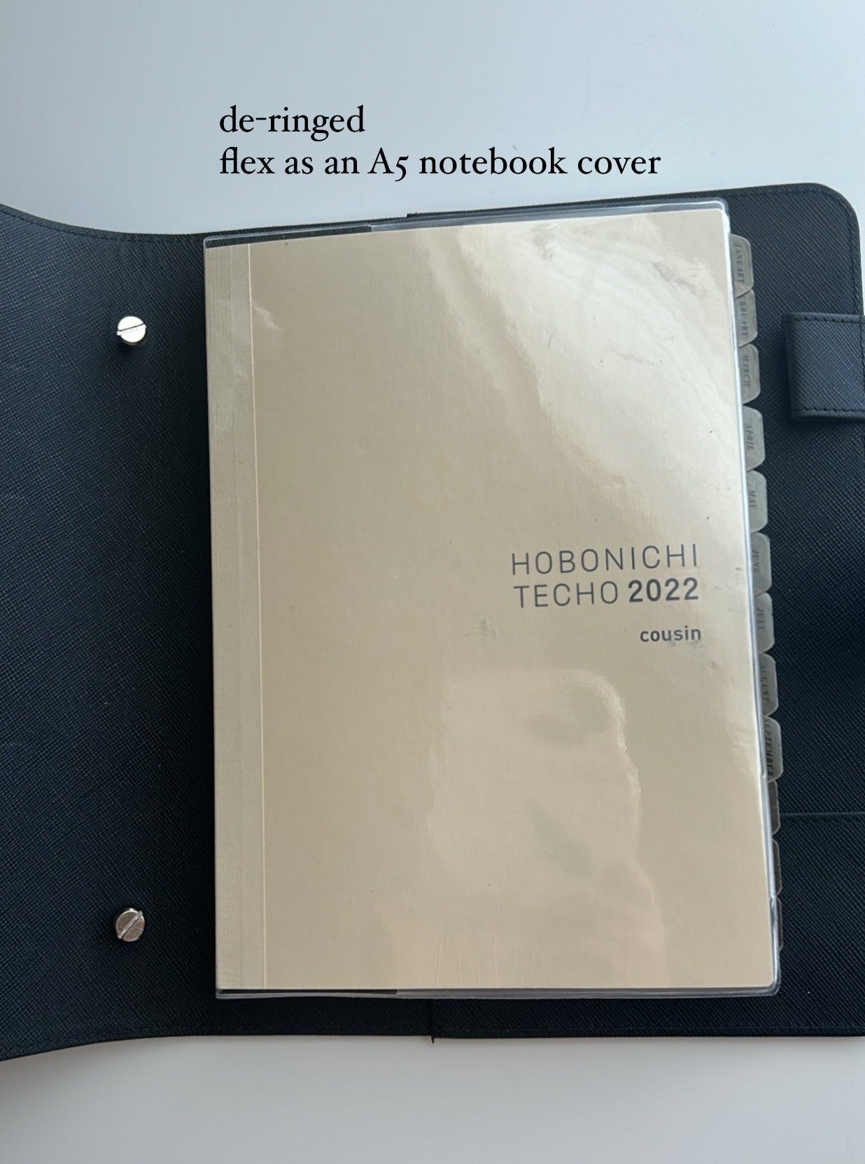 The rings in this planner can be removed to flex as an A5 notebook cover. ( 2 silver posts will be visible in the spine ) It will fit an A5 notebook (with clear cover on) ie hobo cousin, common planner, etc. it is very spacious for a notebook cover. There is more than plenty of room for side tabs and for your notebook to bulk up over the course of the year.