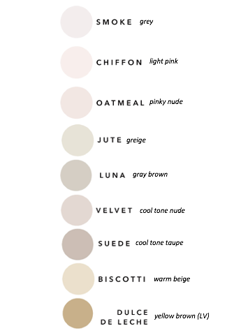 colors available: white (frosted), velvet, suede, dulce de leche from my beige palette.