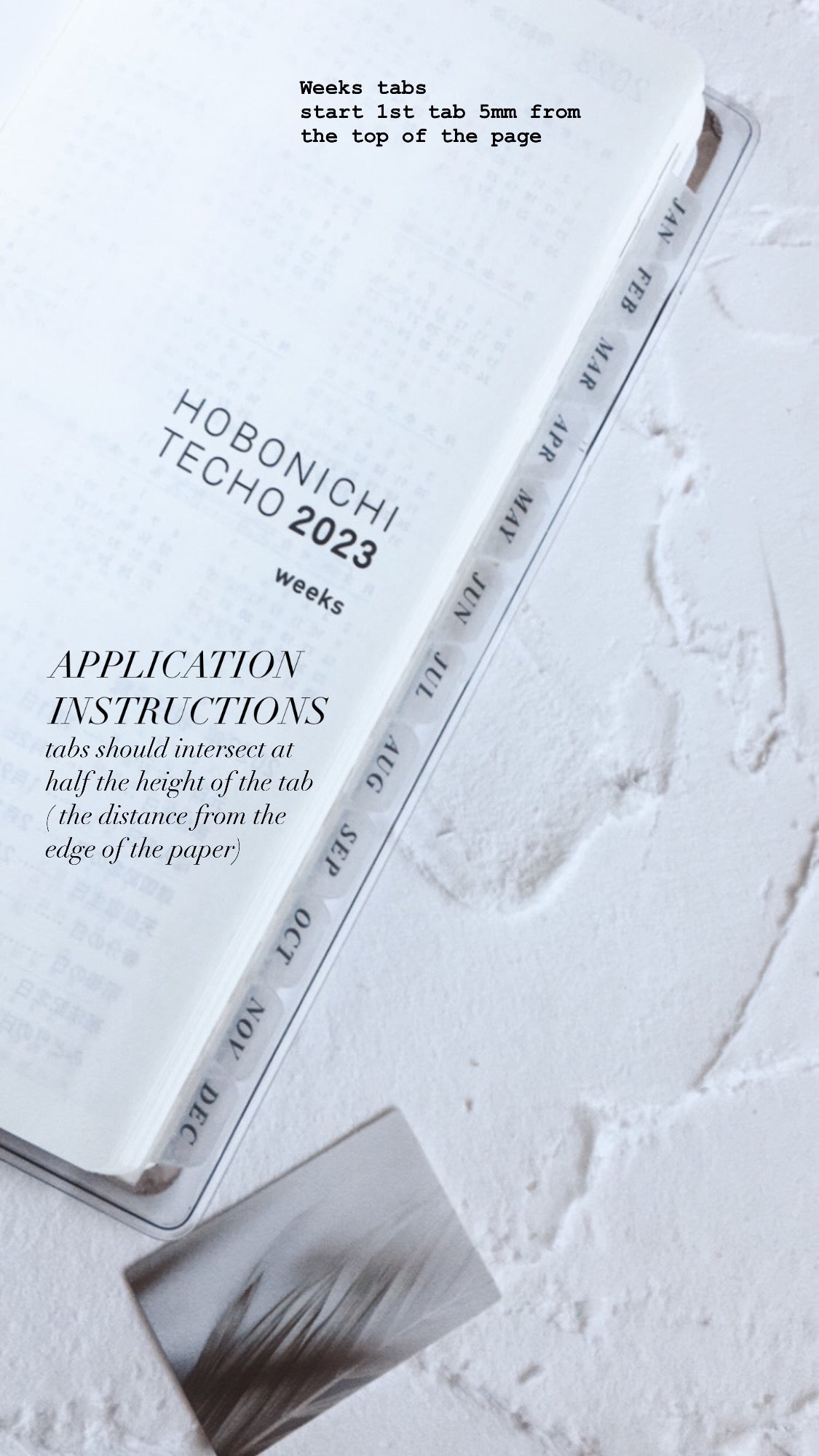 width of 12 month tabs tailored to extend the length of stabdard TN but are ideal for any book bound planner. Please use pictures in listing for an application guide. Start with applying the Jan tab to the very top of your page and work your way down.