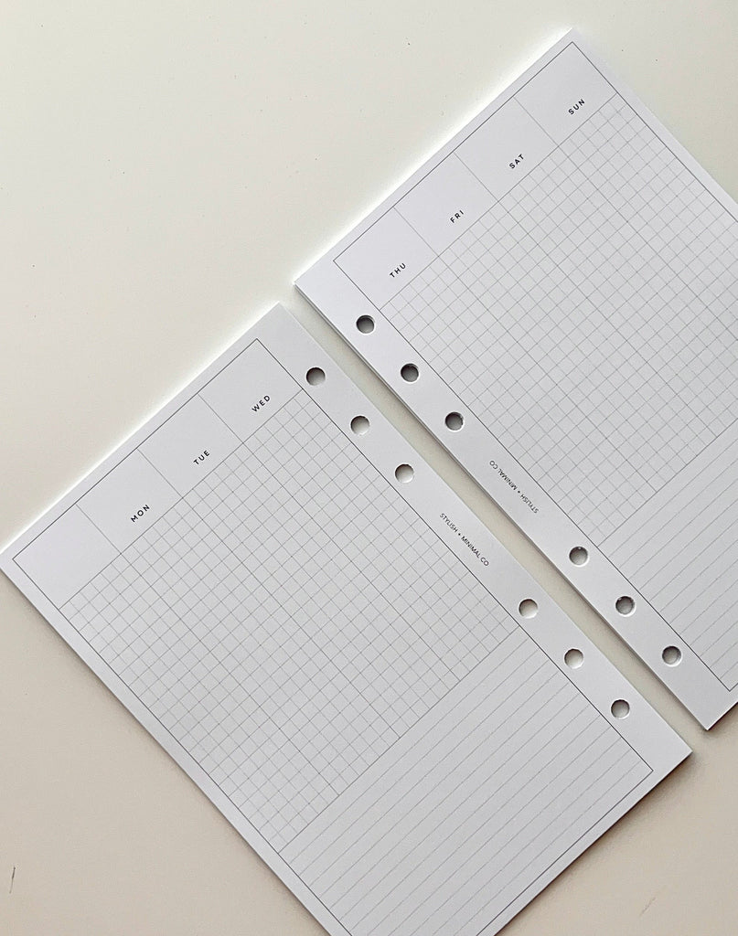- vertical grid + Lined weekly on 2 pages; for universal use